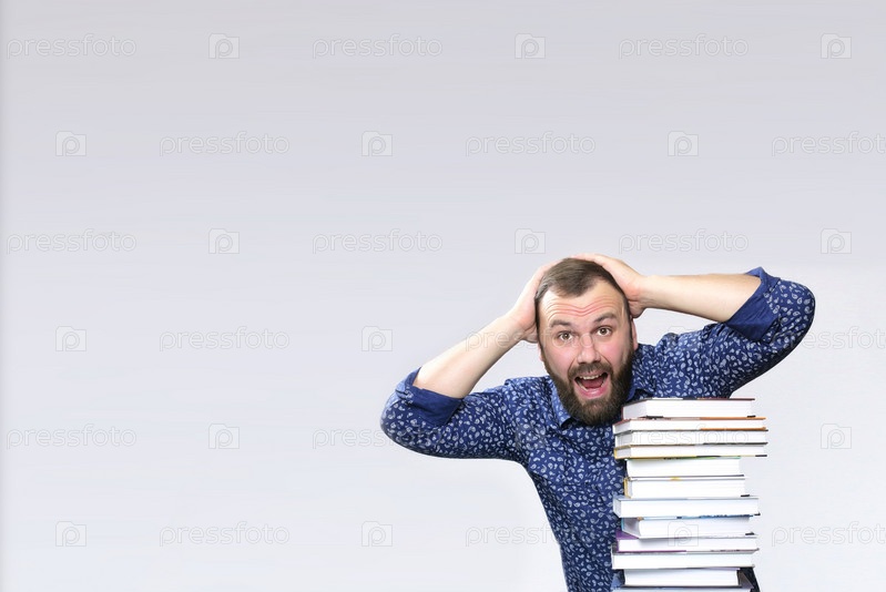 Студент взрослый бородатый мужчина со стопкой книг