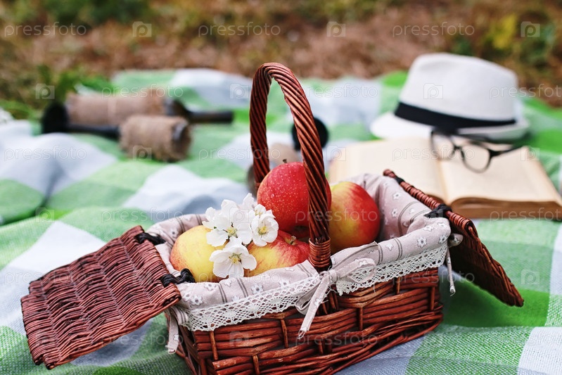 Книга и корзина с едой на пикнике в парке