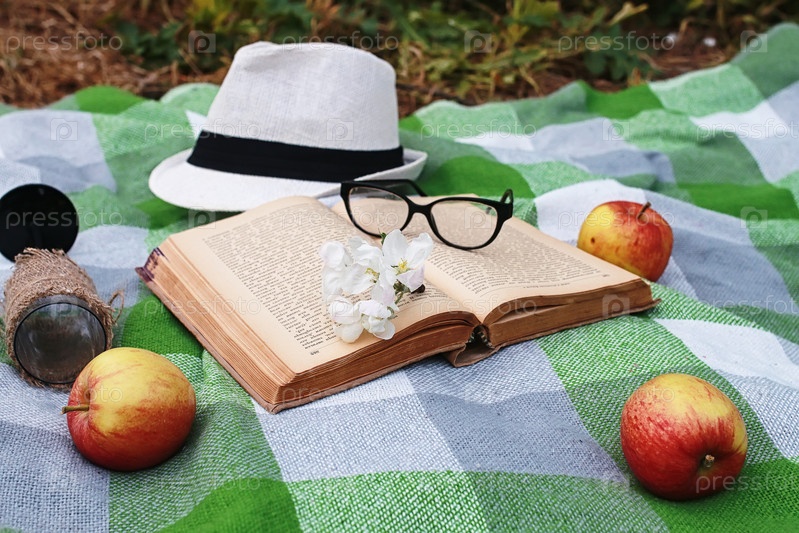 Книга и корзина с едой на пикнике в парке