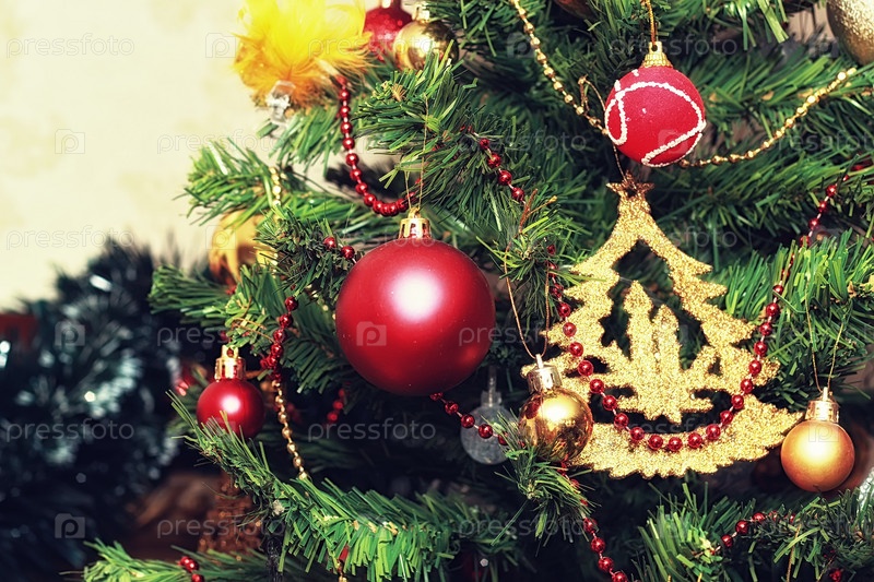 Рождественская елка украшена игрушками на Новый год
