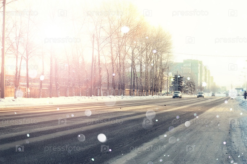 Городская дорога с автомобилем в зимний закат