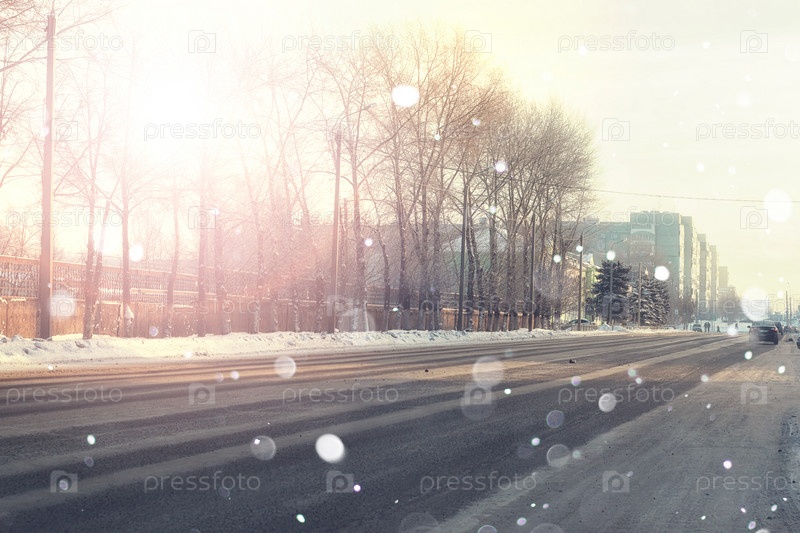 Городская дорога с автомобилем в зимний закат