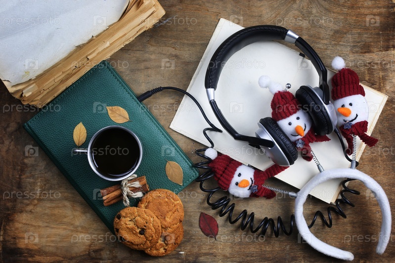 Аудиокнига наушники и книга на деревянном столе