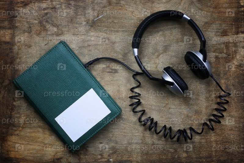 Аудиокнига наушники и книга на деревянном столе