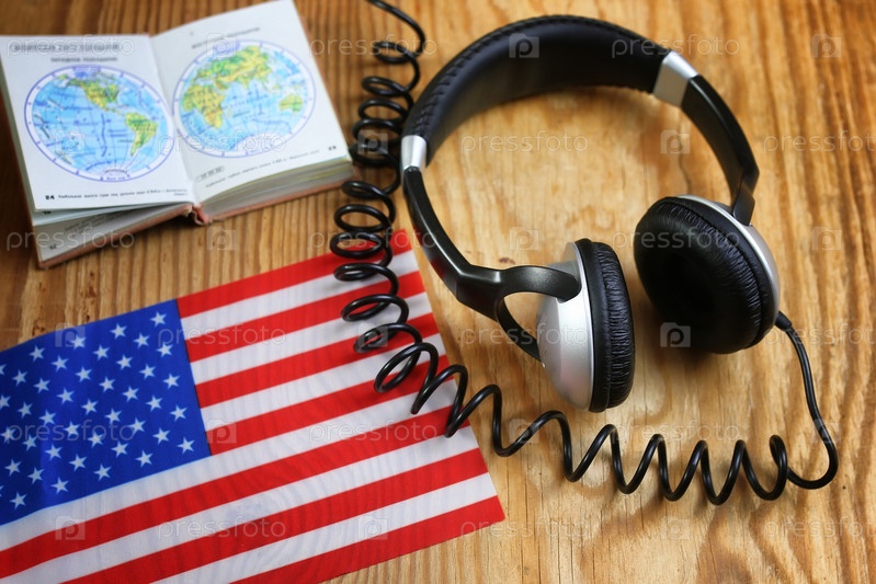 Курсовые языковые наушники и флаг на столе