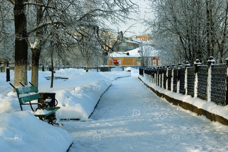 Банка, покрытая снегом зимний парк