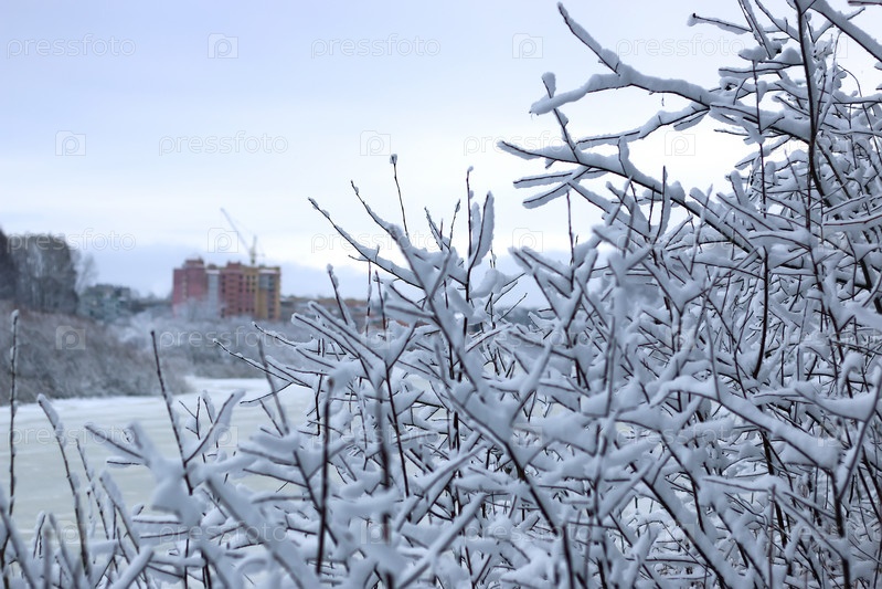 Зимний снег на дереве фоне строительства
