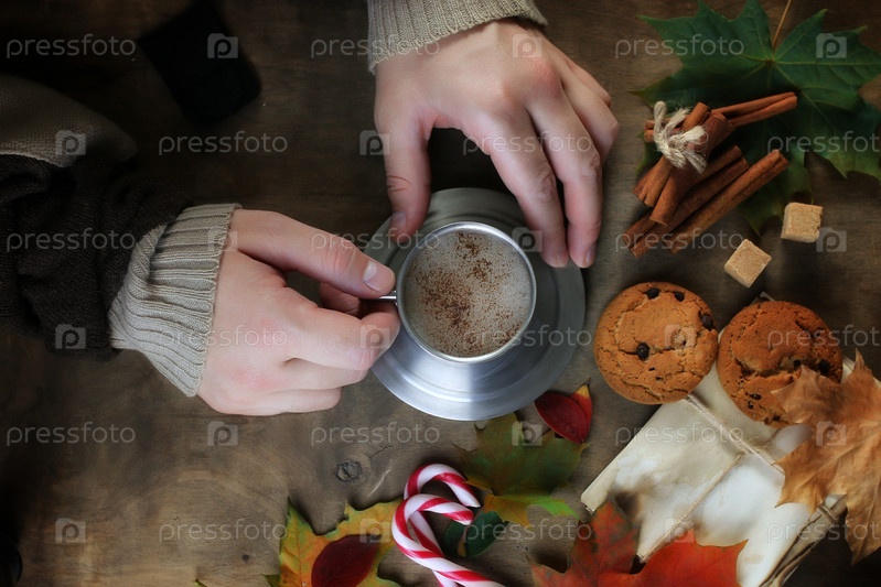 Руки, держащие кружку горячего кофе на столе