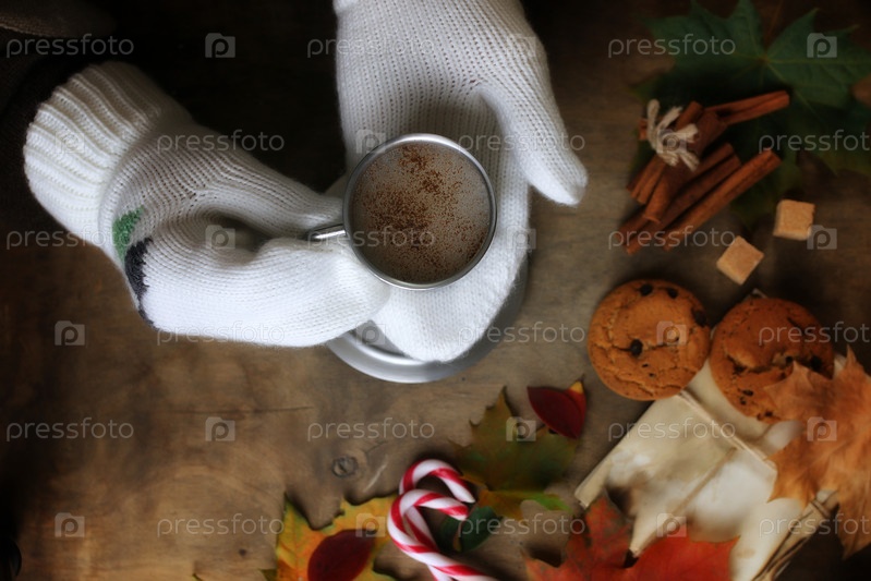 Руки, держащие кружку горячего кофе на столе