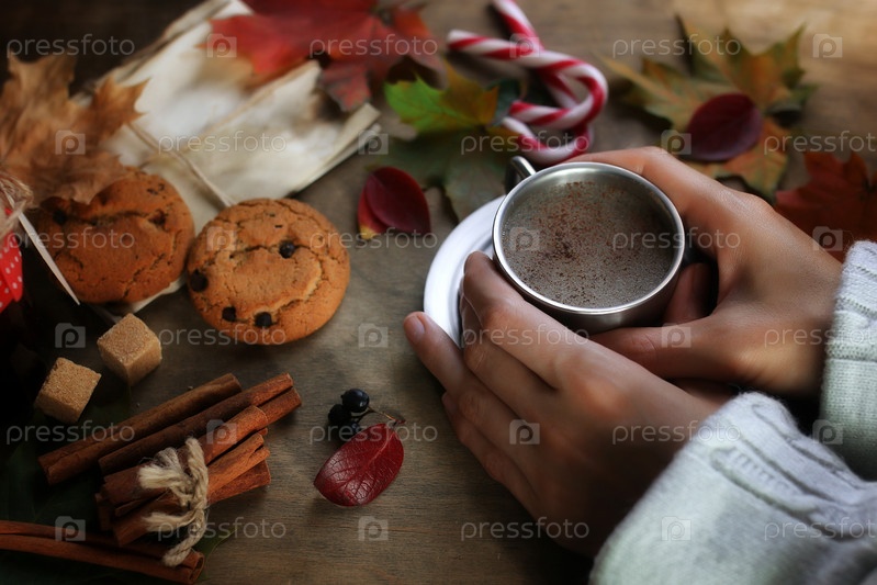 Руки, держащие кружку горячего кофе на столе