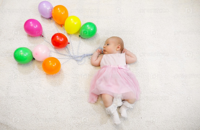 Маленькая девочка держит кучу воздушных шаров и летные шоу