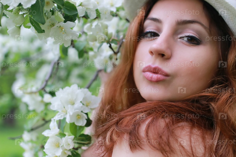 Девушка в цветущем яблочном саду