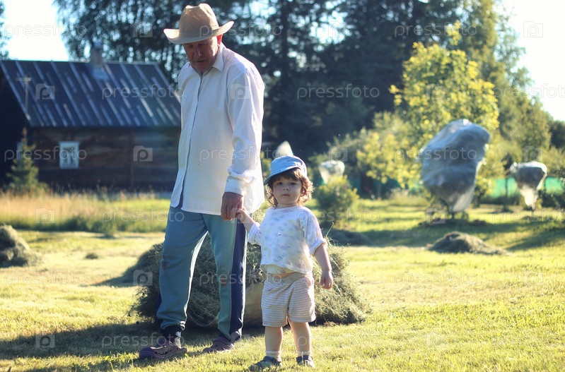 Ребенок и дед сельское поле