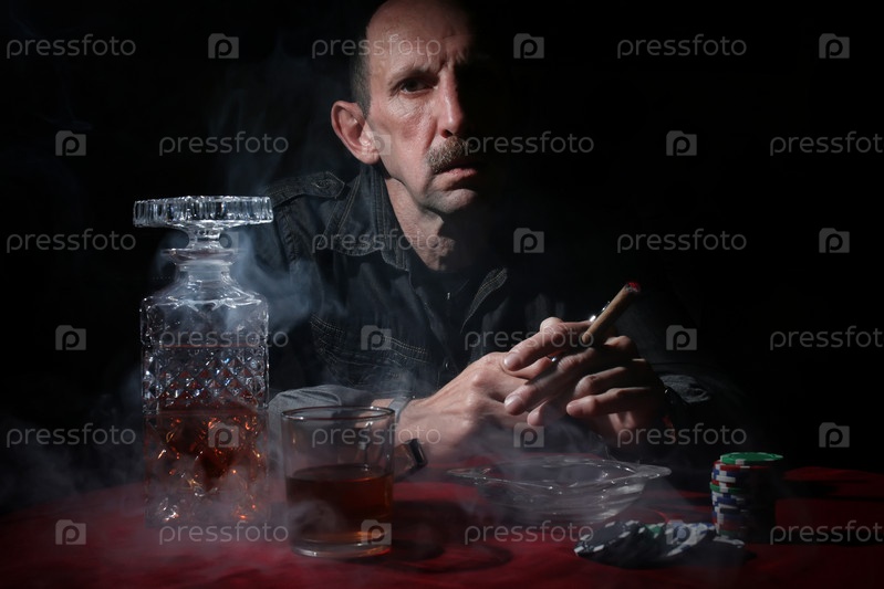 Человек курит трубу и играет в покер