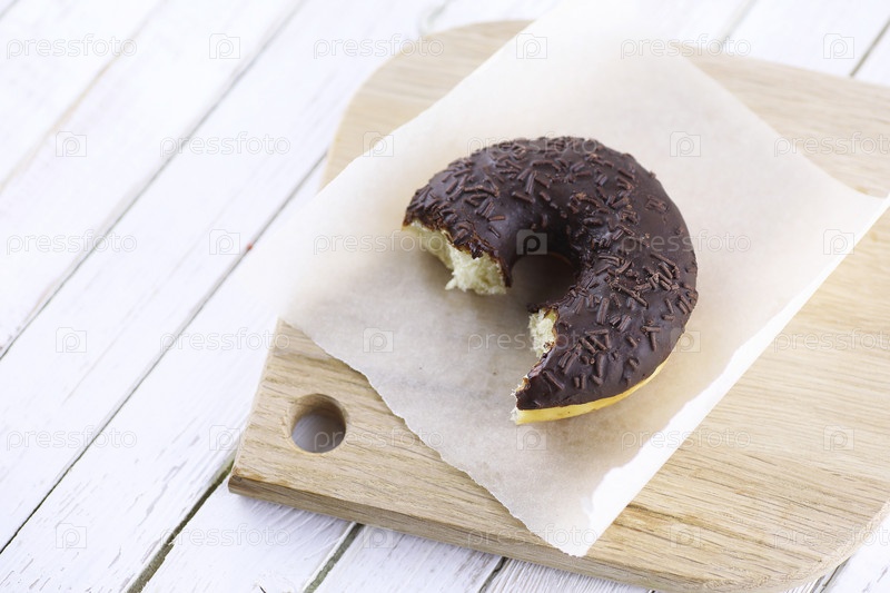 Шоколадный пончик на белом деревянном фоне