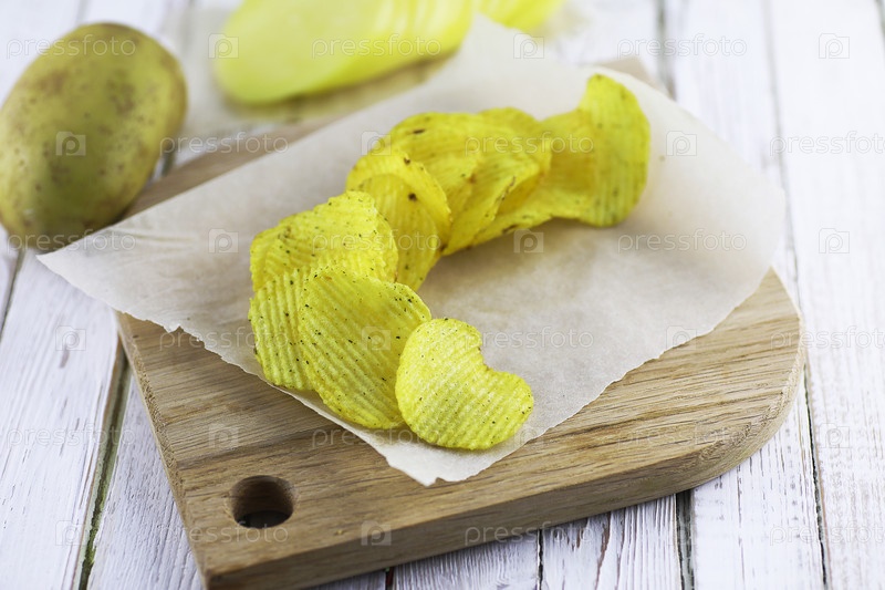 Картофельные чипсы на деревянной подносе