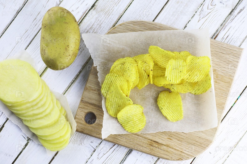 Картофельные чипсы на деревянной подносе