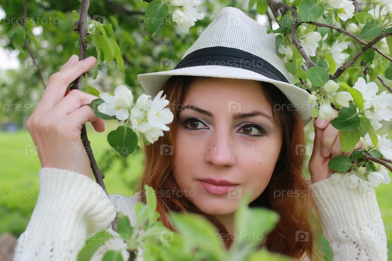 Девушка в цветущем яблочном саду