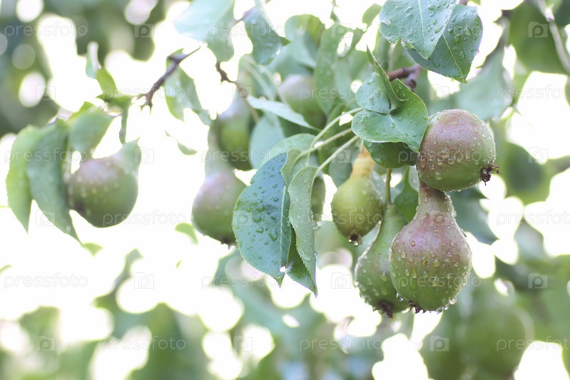 Груша на ветке дерева - дождевая капля