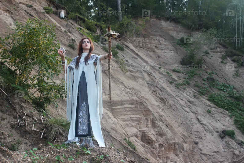 Шаман с посохом и стеклянным шаром на открытом воздухе