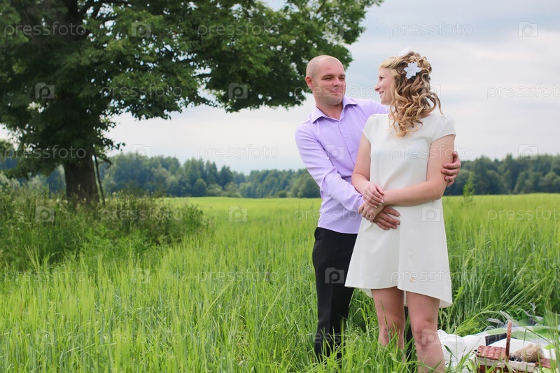 Пара влюбленных, гуляющих по поле летом