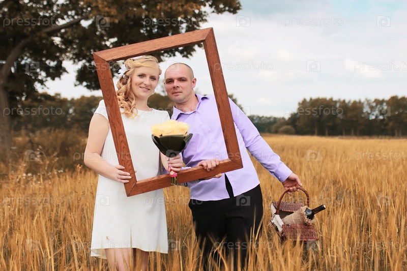 Просто женатые влюбленные, идущие по поле осенним днем
