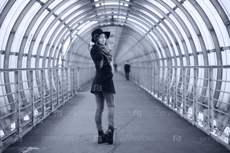 Молодая взрослая девушка в архитектурном туннеле