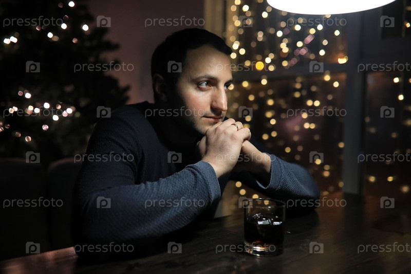 Мужчина со стаканом виски в пабе ночью