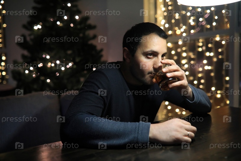 Мужчина со стаканом виски в пабе ночью