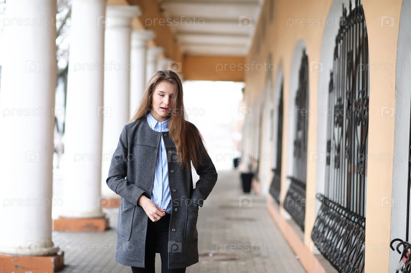Молодая красивая девушка на прогулке возле здания с колонной