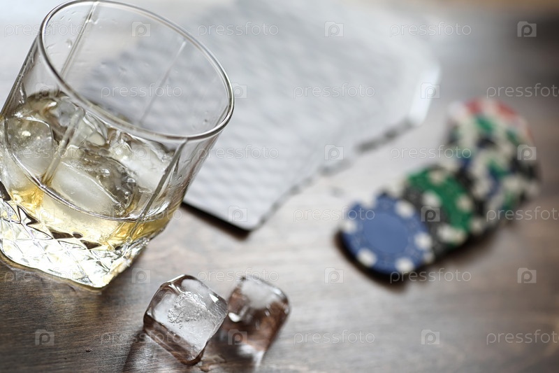 Стакан виски с льдом на столе