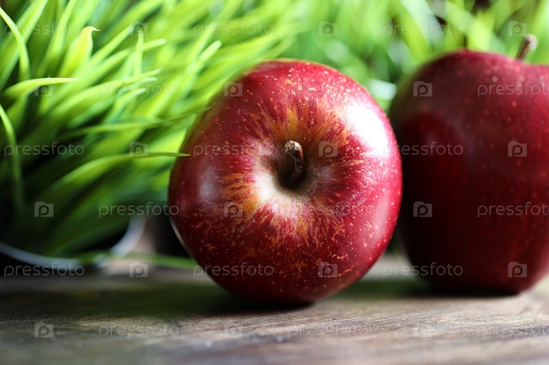Красное свежее яблоко на деревянном столе