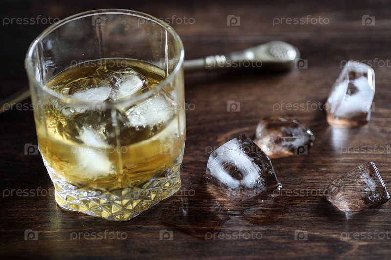 Виски в стакане и кусочки льда на дереве