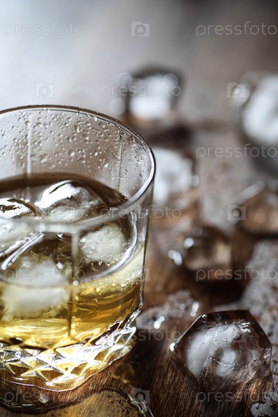 Виски в стакане и кусочки льда на дереве