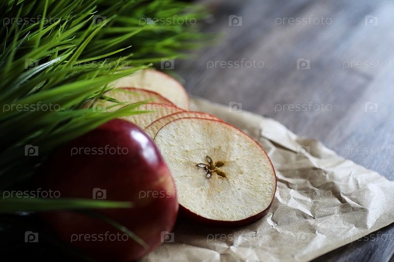 Красное свежее яблоко на деревянном столе