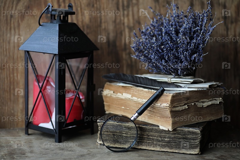 Старые книги на деревянном столе и увеличитель