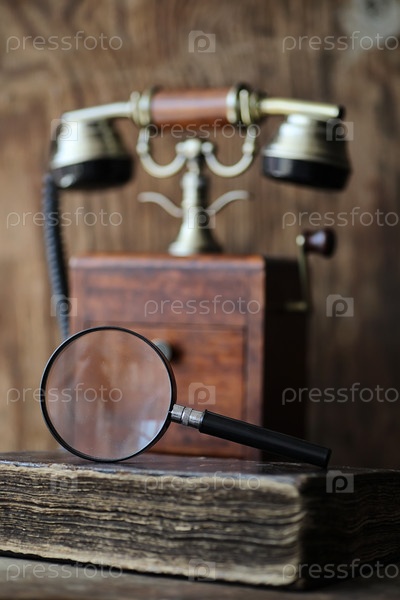 Старый телефон и ретро-книга на дереве