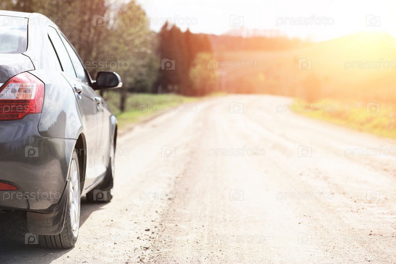 Автомобиль на сельской дороге на закате солнца фоне