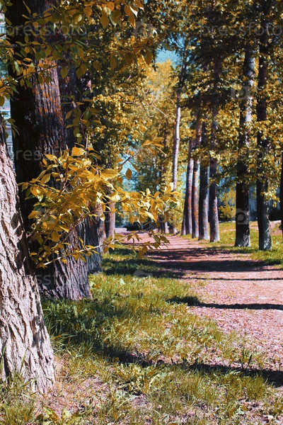 Аллея тополей с пожелтевшими листьями в конце лета