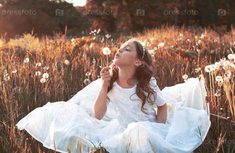 Девушка вдыхает семена из цветка одуванчика осенью