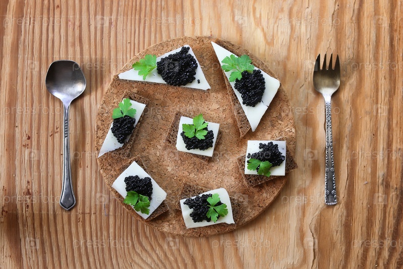Закуска черный икры на деревянном фоне
