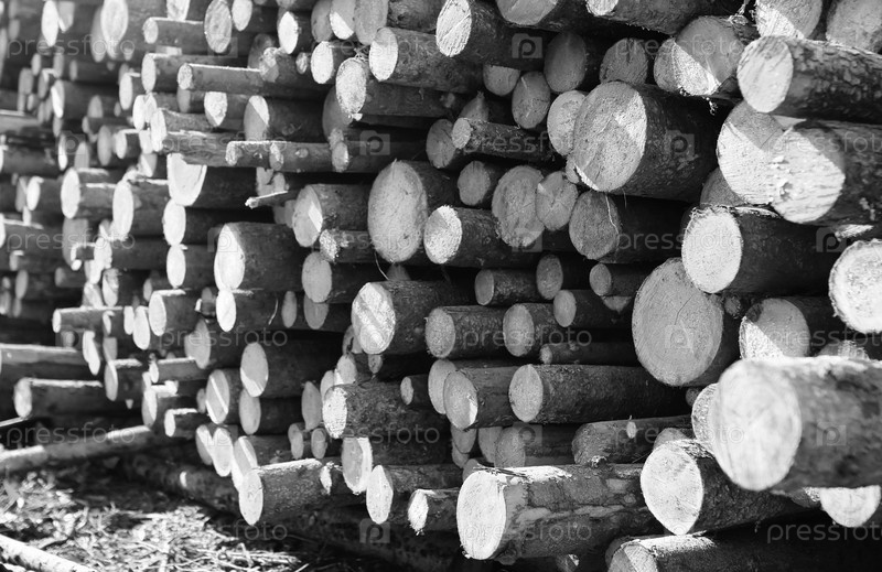 Черно-белая фотография длинных пиловых бревен, лежащих на куче