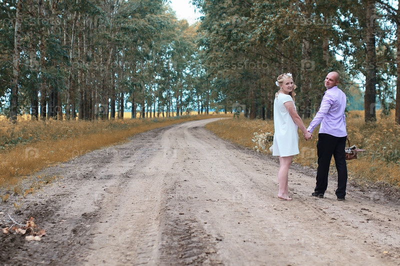 Просто женатые влюбленные, идущие по поле осенним днем