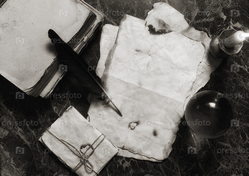 Старые ретро-бумаги и книга на столе с детективными инструментами backgro