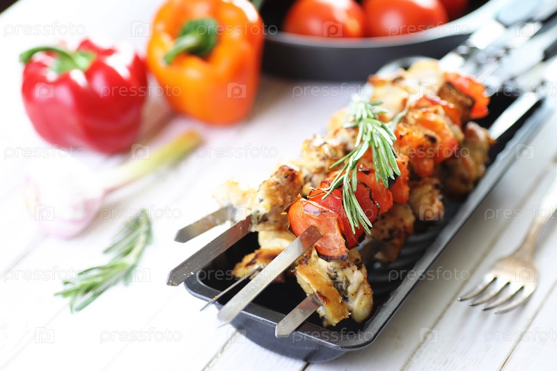 Кебаб, приготовленный на металлических колючках с овощами