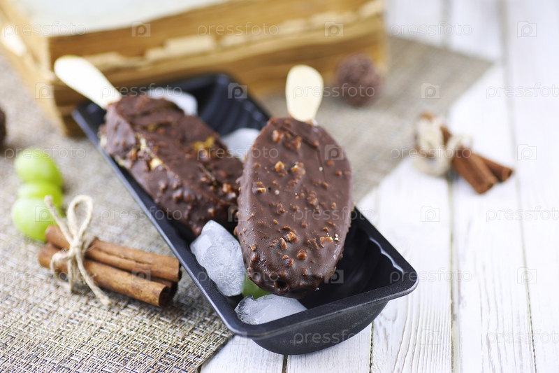 Десерт шоколадное мороженое с орехами на деревянной палочке