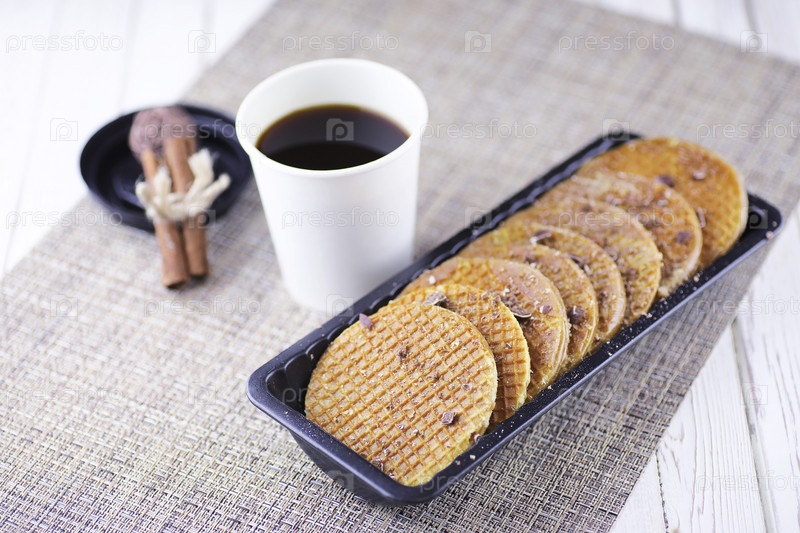 Венские вафли с карамелем на деревянном фоне