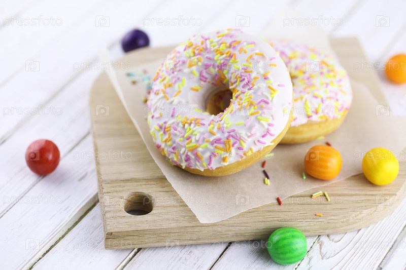 Донат на белом деревянном фоне