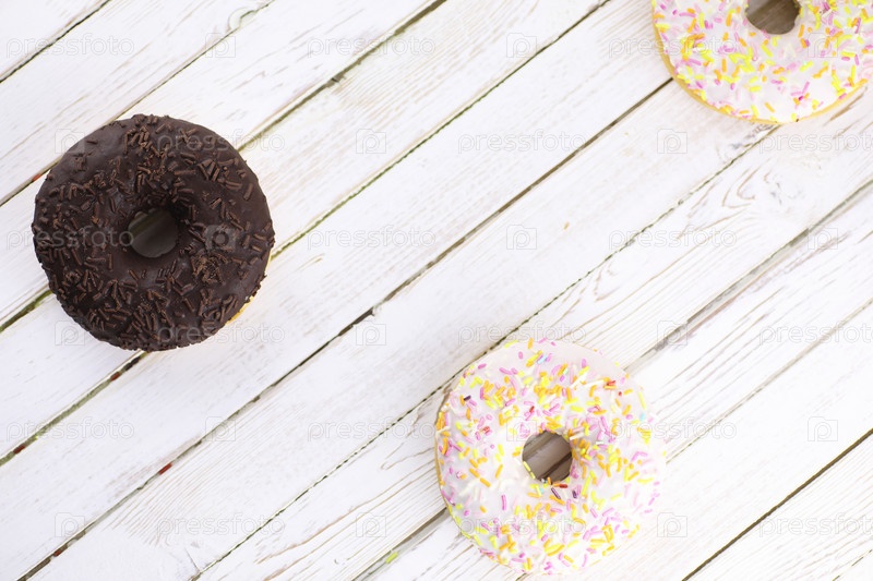 Шоколадный пончик на белом деревянном фоне