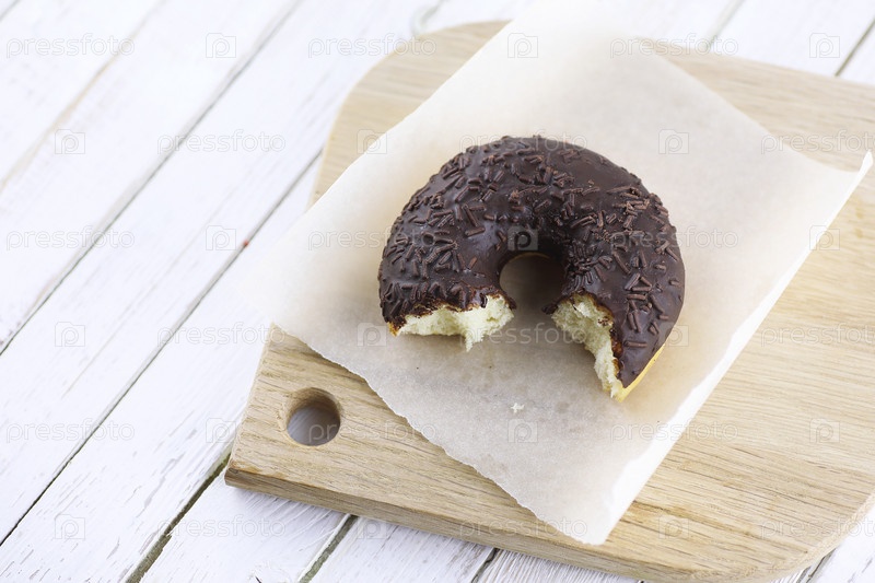Шоколадный пончик на белом деревянном фоне